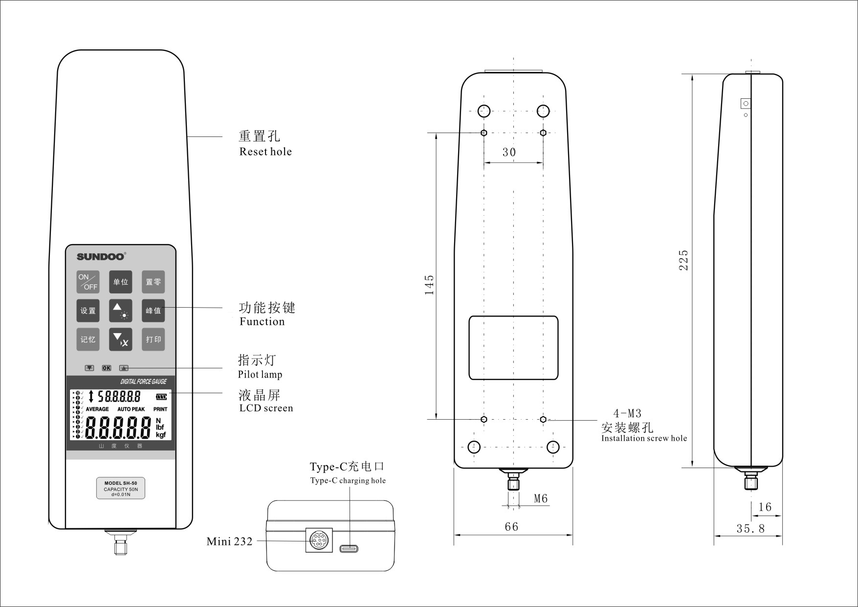 高精度高分辨率,準確度0.5級,最小讀數達0.001N; 專用于電腦鍵盤、按鍵按鈕的按壓力測試,并可選配SPF按鍵專用測試機架,組合成專業的按鍵按鈕試驗機; 峰值自動解除功能,抓取測試中的峰值,保持顯示1~10秒(可自由設定)后自動解除,等待下一個峰值); 比較功能,上下限偏差值自由設定,紅綠指示燈及蜂鳴器自動聲光報警設置; 記憶功能,可存儲10組測試數據,平均值計算功能; 三種單位變換,可換N、kgf、lbf三種計測單位,并自動換算; LCD液晶屏可翻轉顯示,按住單位鍵3秒后放開,可翻轉LCD液晶屏顯示方向; 自動關機功能, |